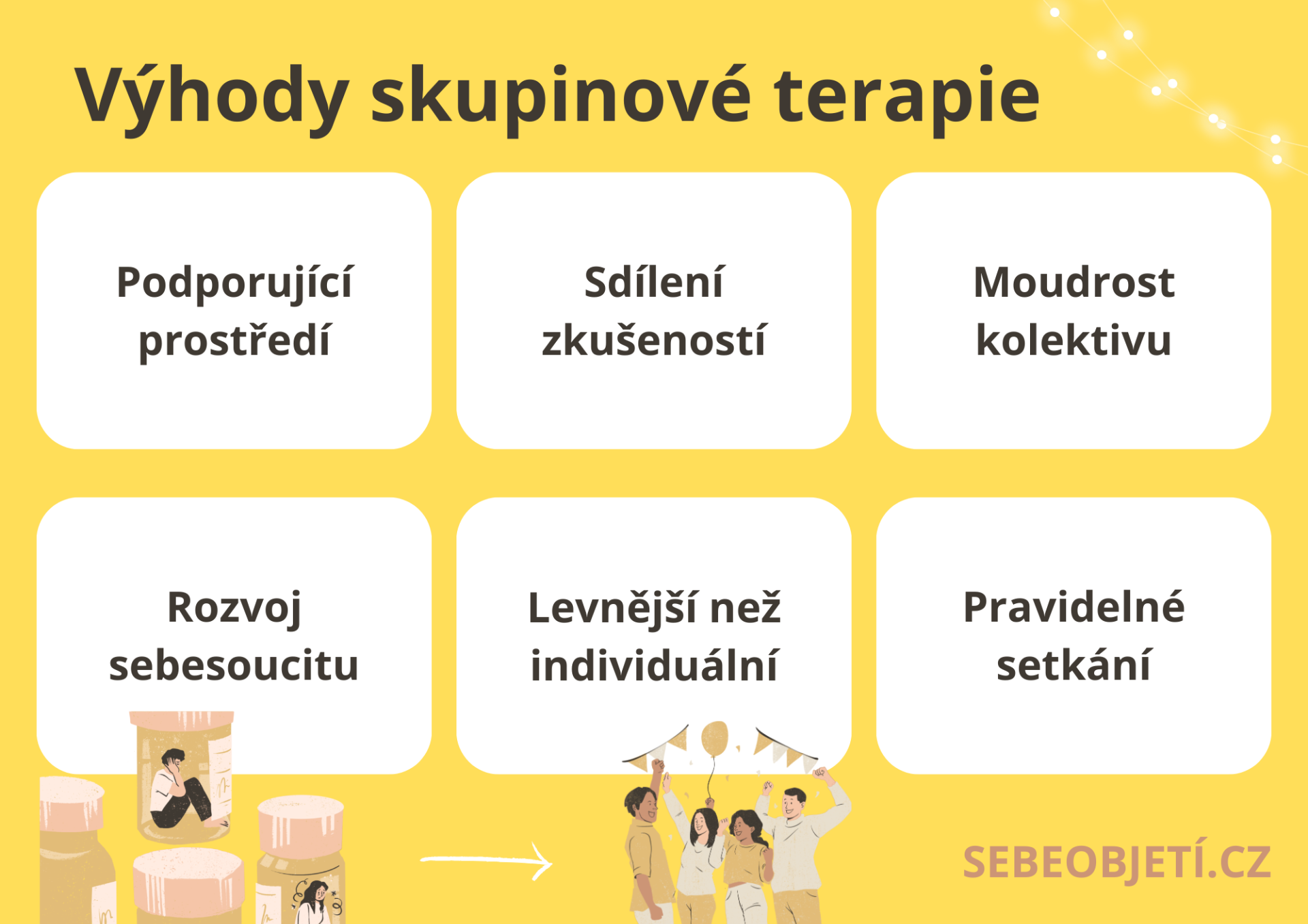 Proto, aby vám mohla být skupina užitečná nemusíte zažívat obrovské trápení. Budeme se pohybovat na hraně terapie, koučingu a seberozvoje. Rády používáme metaforu, že terapie může být jako chození výtahem místo schodů. I když bych ještě zvládla vyšlápnout schody, můžu se rozhodnout někdy šetřit síly, nebo si dopřát pohodlí, nebo rychlejší cestu a rozhodnu se pro výtah.